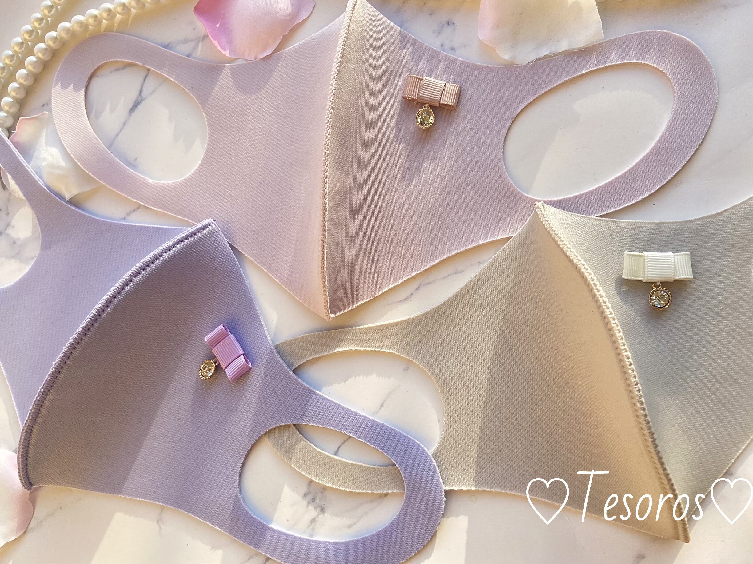 シンプルマスクに小さめリボン×大きめビジューで可愛さアップ♡