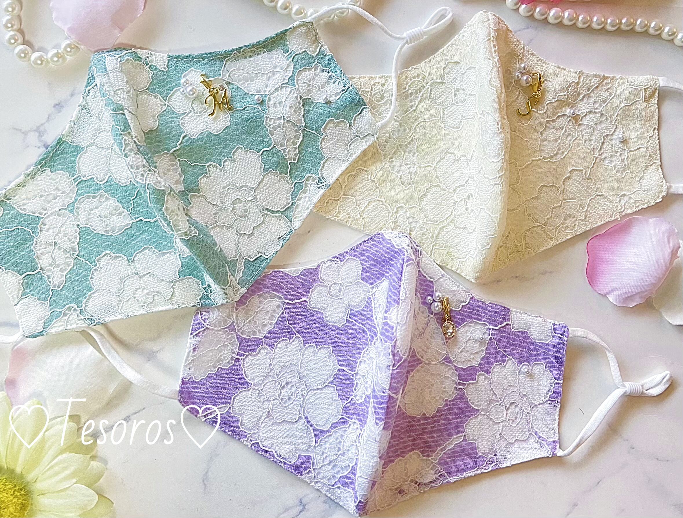 イニシャルチャーム付薄手レースマスク〈柄グリーン〉