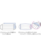 内側の両端に不織布マスクのゴム紐を通して、マジックテープで固定するタイプです