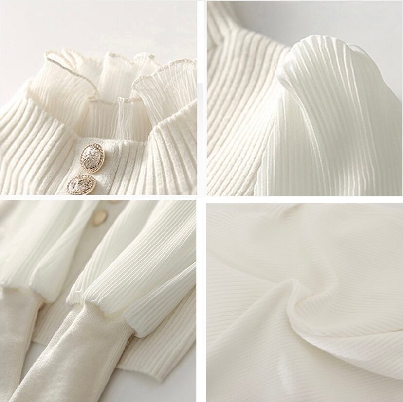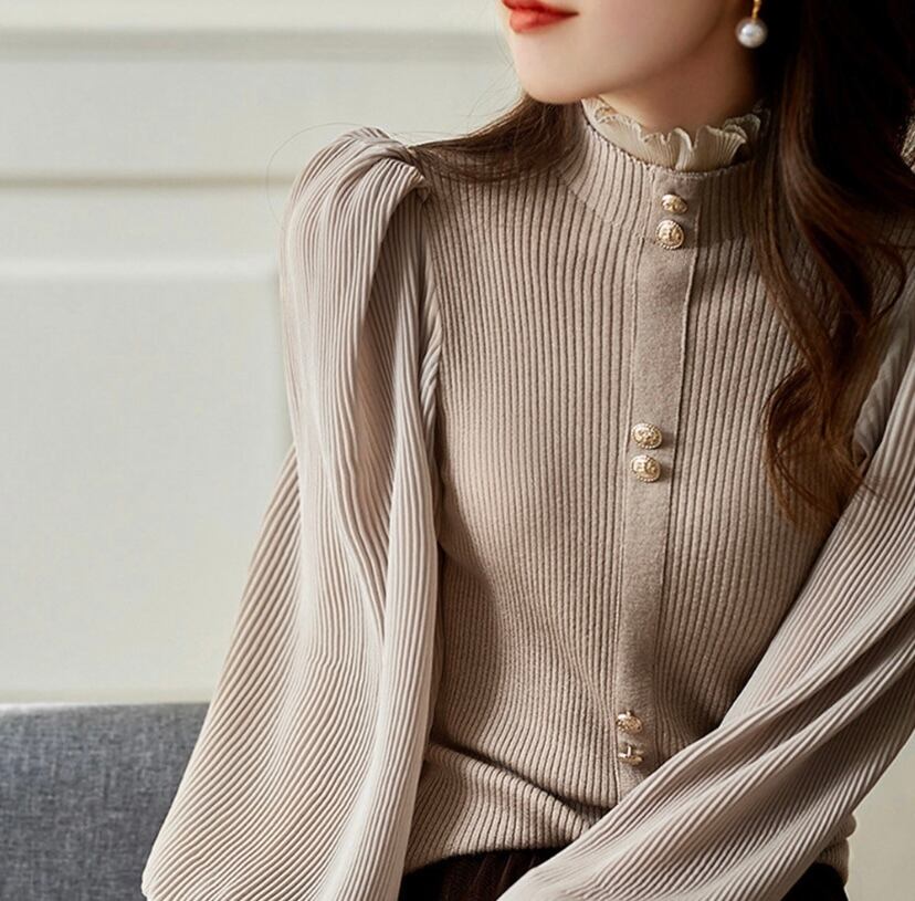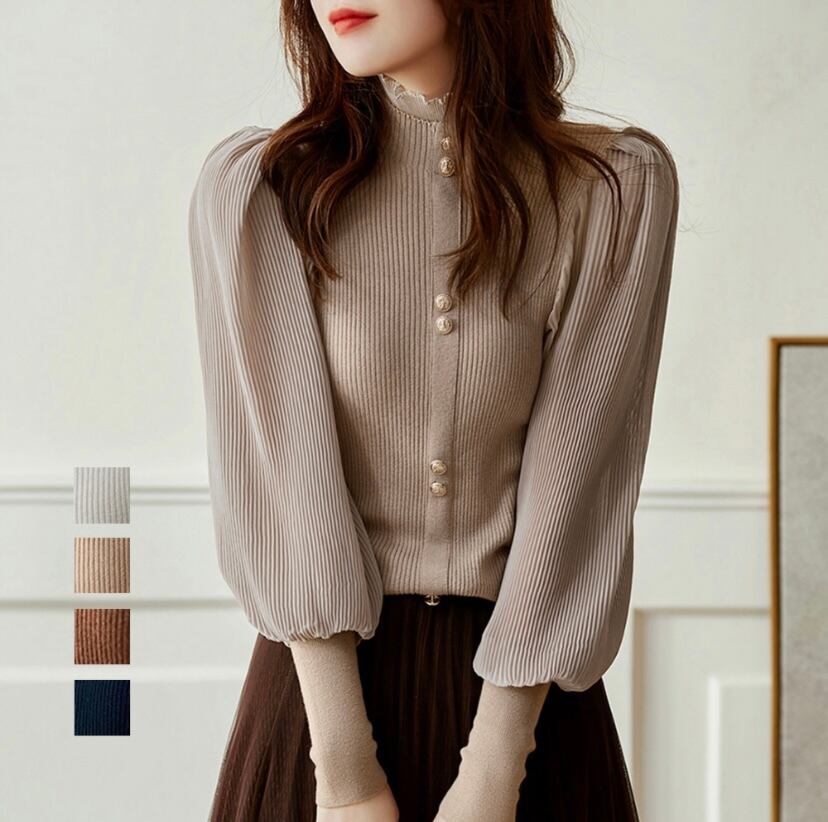 リブニットとプリーツシフォンの異素材ドッキングデザイン◌⑅⃝