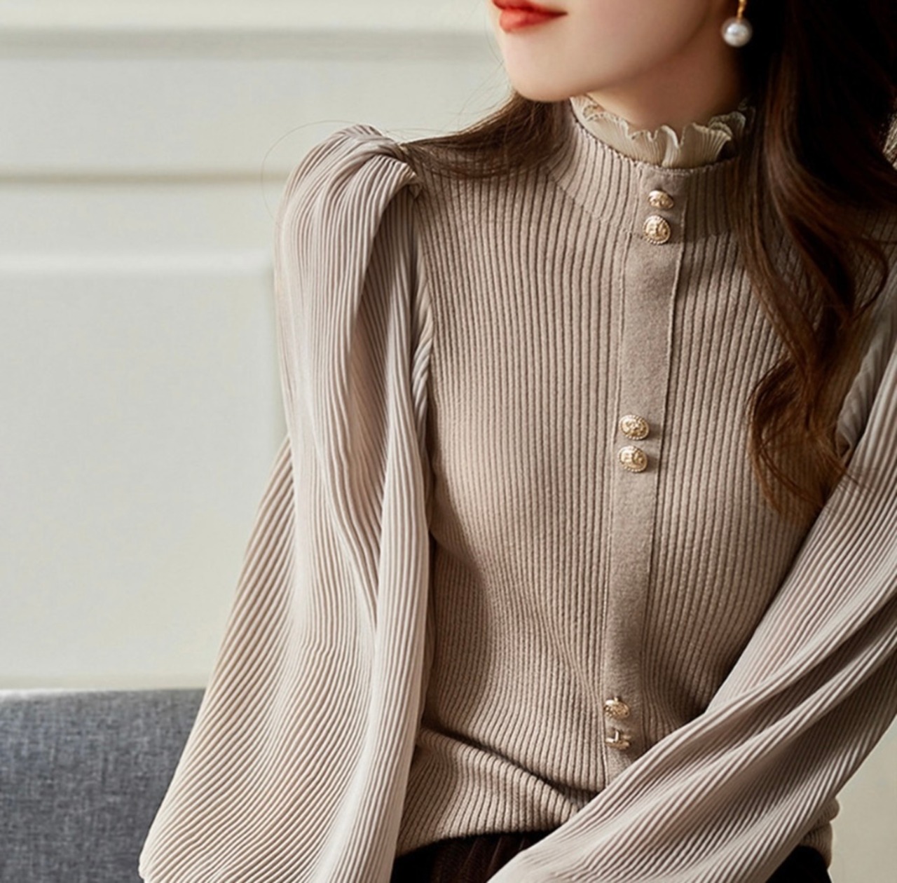 リブニット×プリーツシフォントップス〈モカ〉