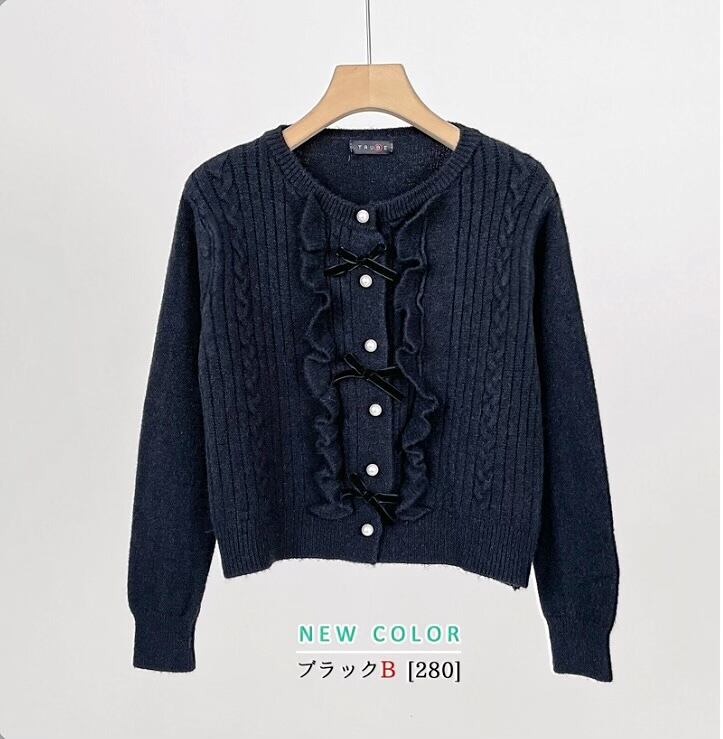 フロントにはフリル、前立てにはパールとミニリボンを施したニットカーディガン◌⑅⃝