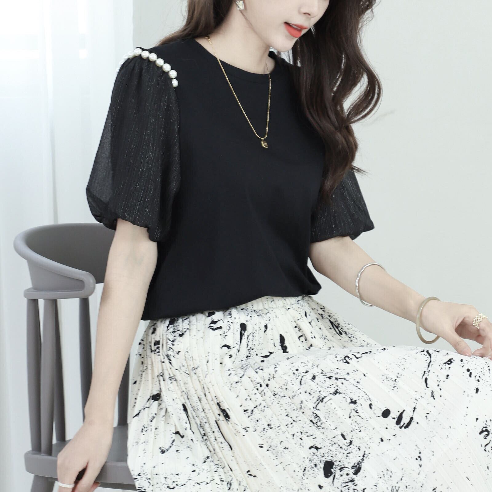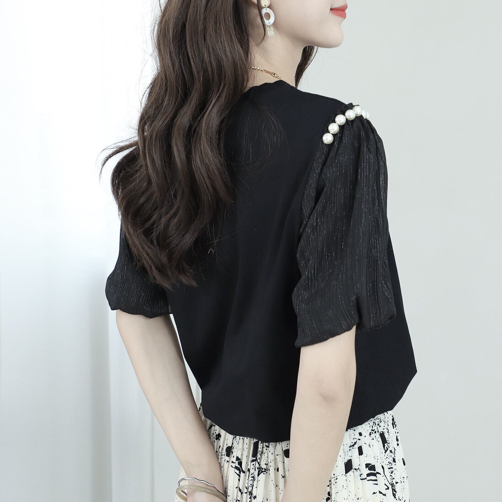 袖シフォンパール使いプルオーバー〈ブラック〉