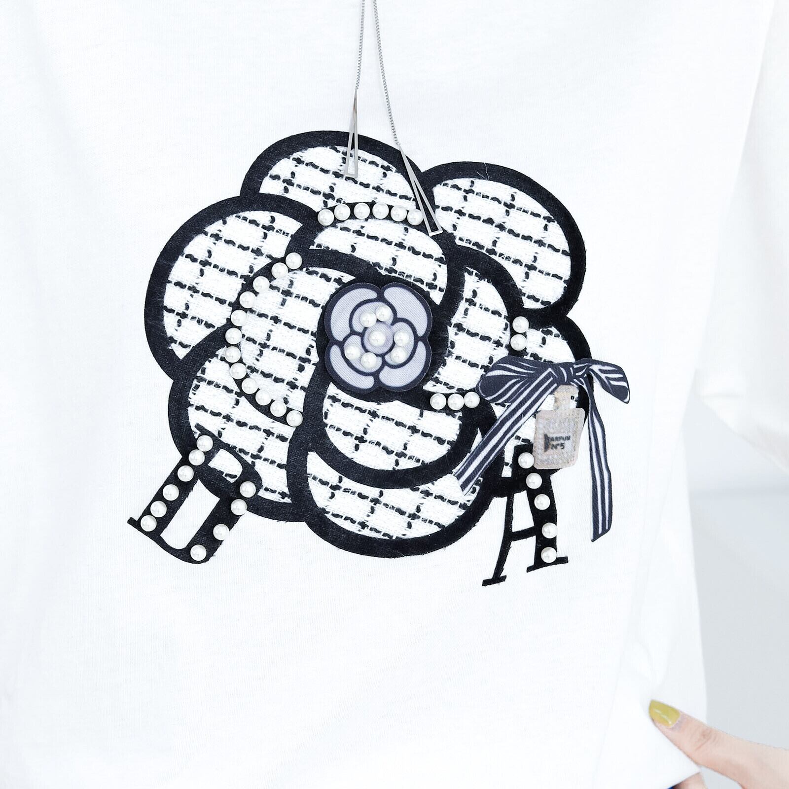 ビジュー付きカメリアプリントTシャツ〈ホワイト〉