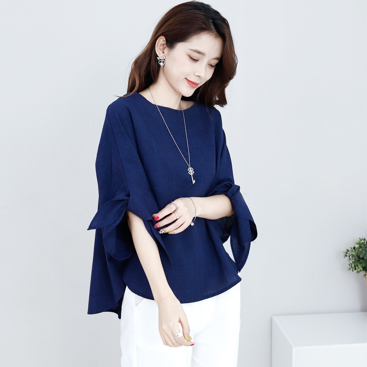 袖口にあしらえたリボンがアクセントになったゆったりブラウス