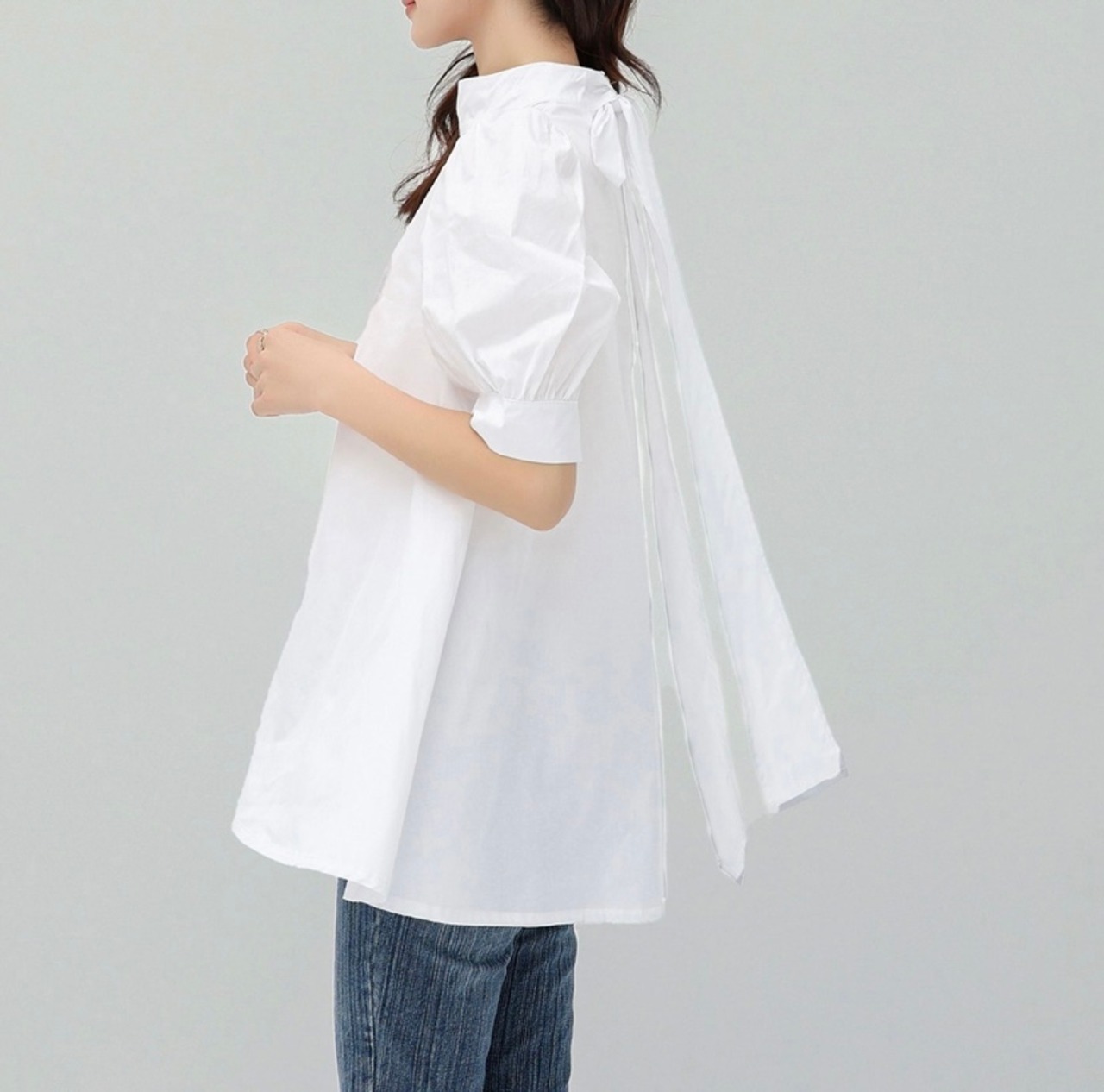 たっぷりとタックを入れたパフ袖は大人フェミニンと程よく肩の力が抜けたリラックス感、半袖より少し長めの5分袖の丈感によって気になる二の腕がさりげなくカバーされて嬉しい◎