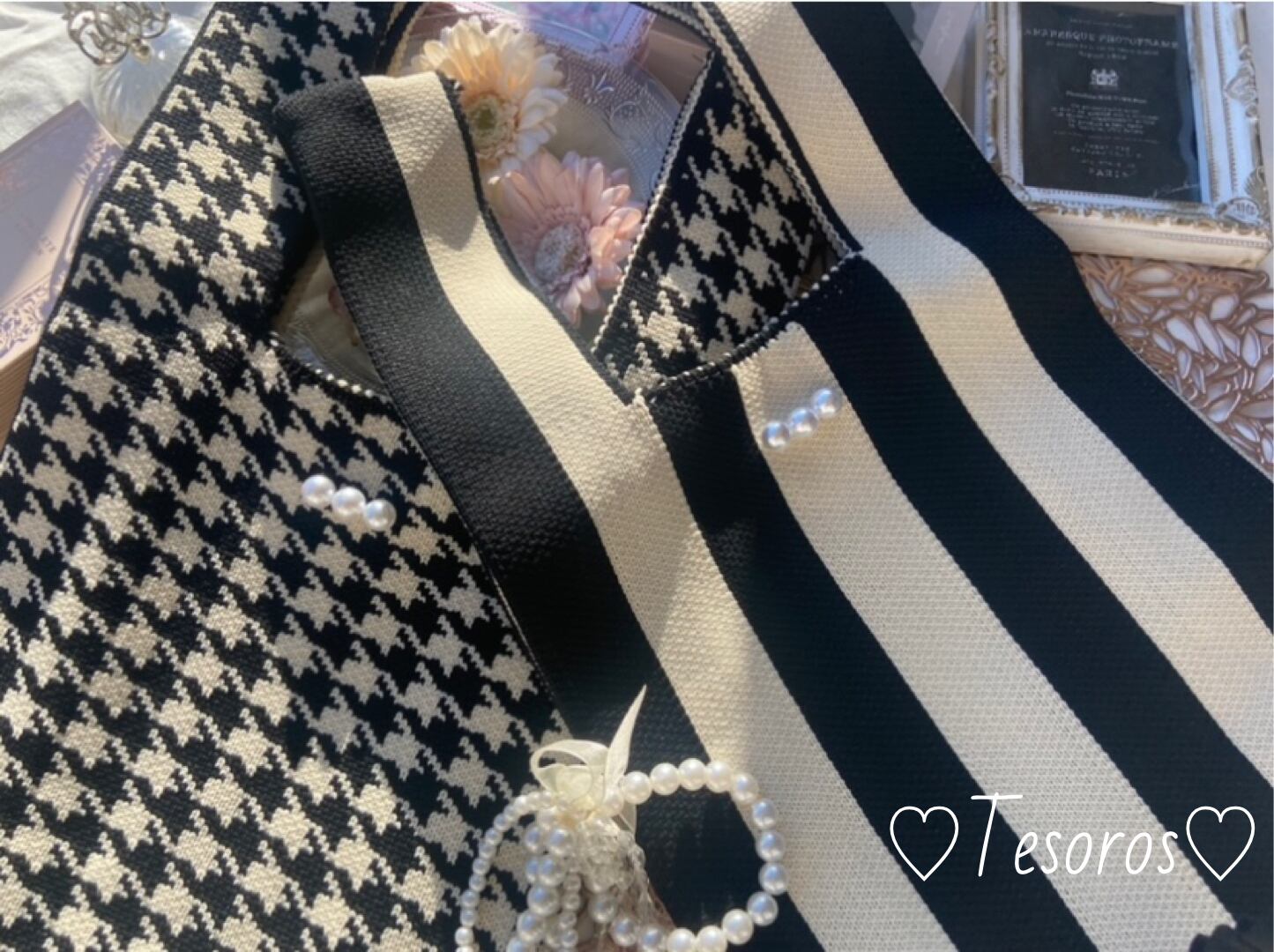 大粒パール付ニットバッグ〈ストライプ 柄〉