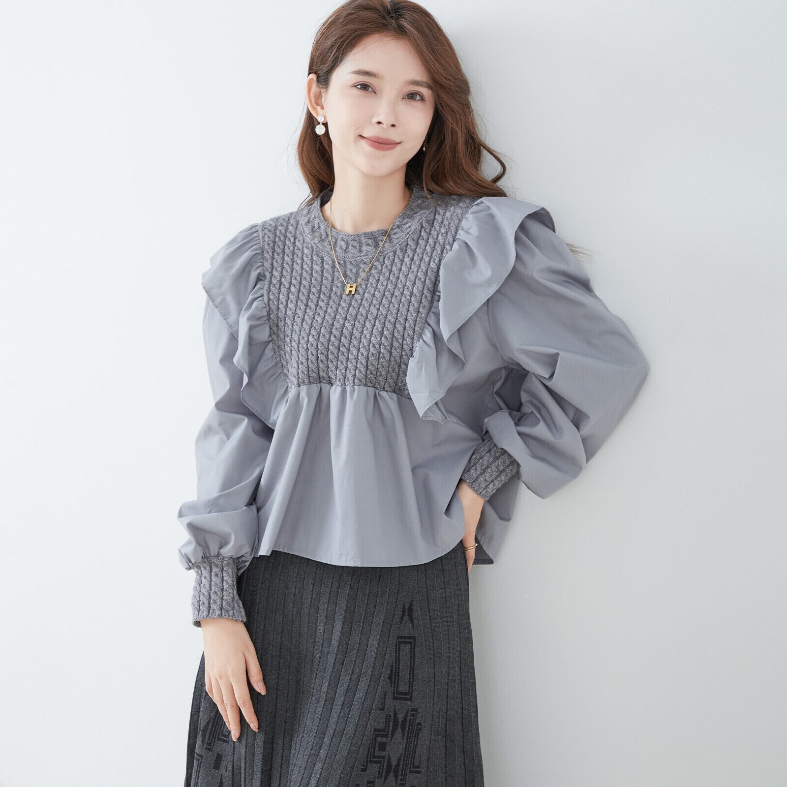 ケーブルニットドッキングフリルブラウス〈グレー〉