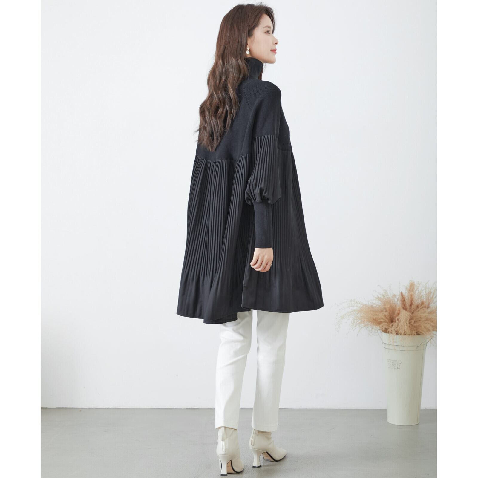 袖口とデコルテ部分はニット仕立て、胸下はプリーツ加工のブラウスに切り替えたデザイン