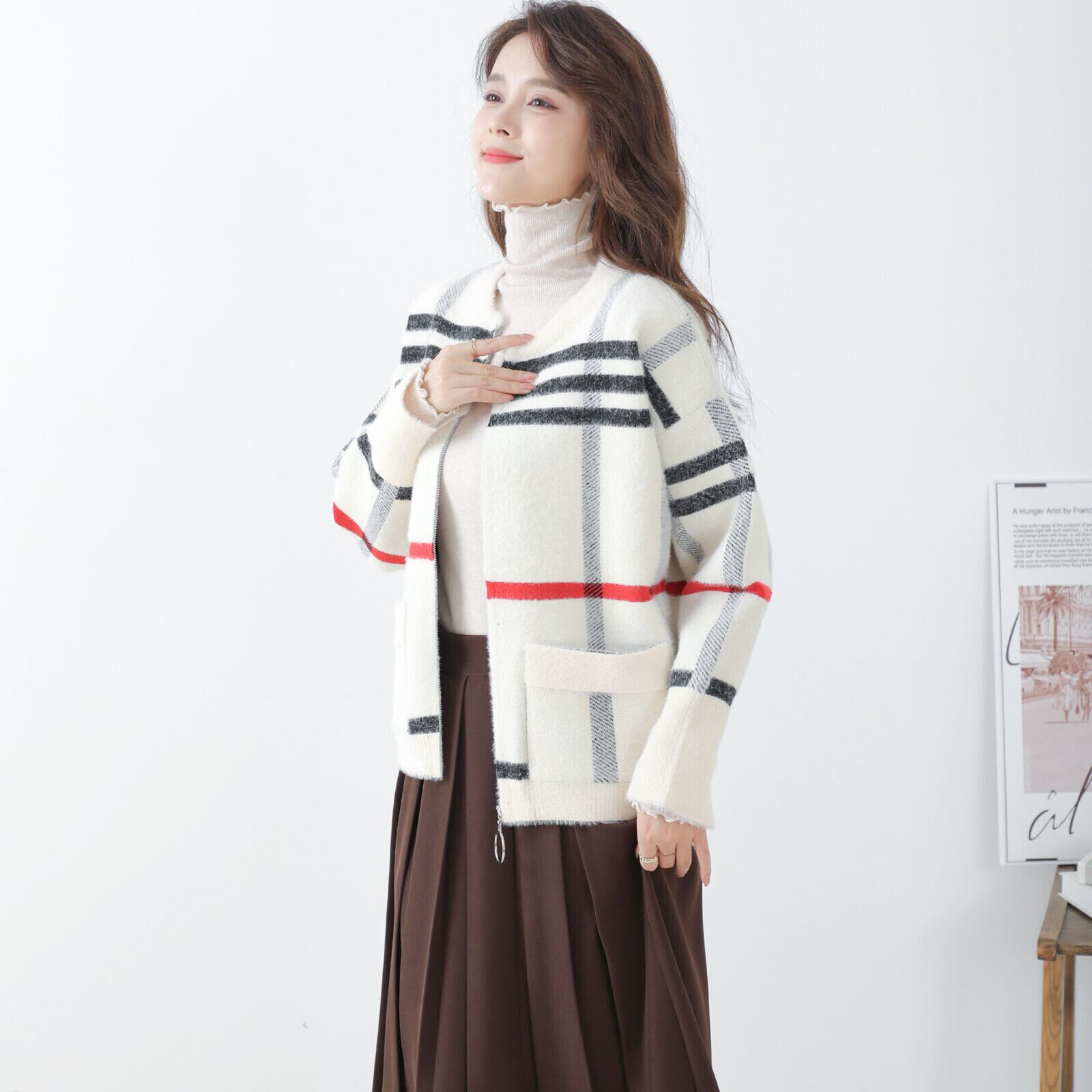 パッと目を惹くチェック柄が魅力のジップアップニットジャケット◌⑅⃝