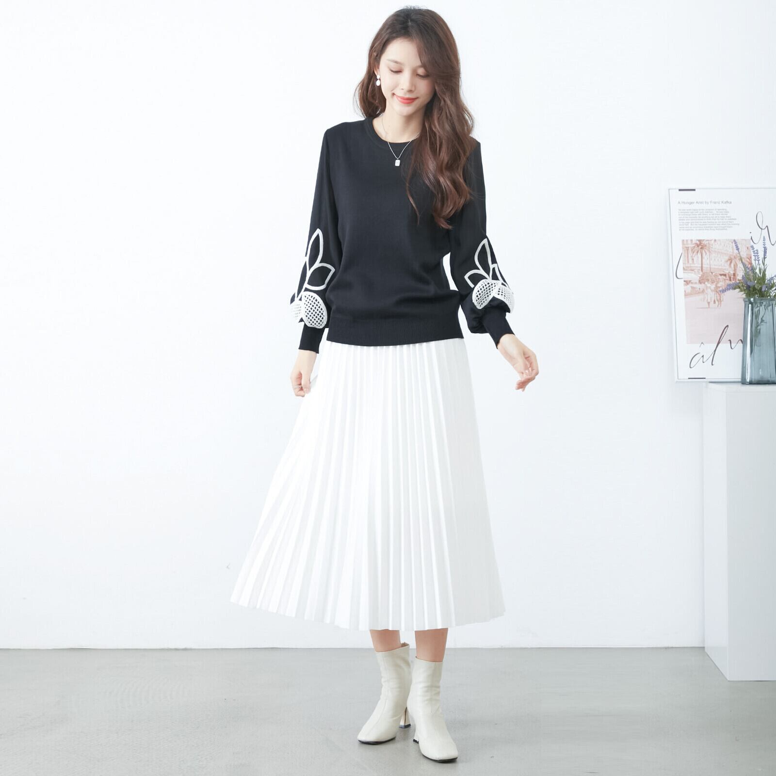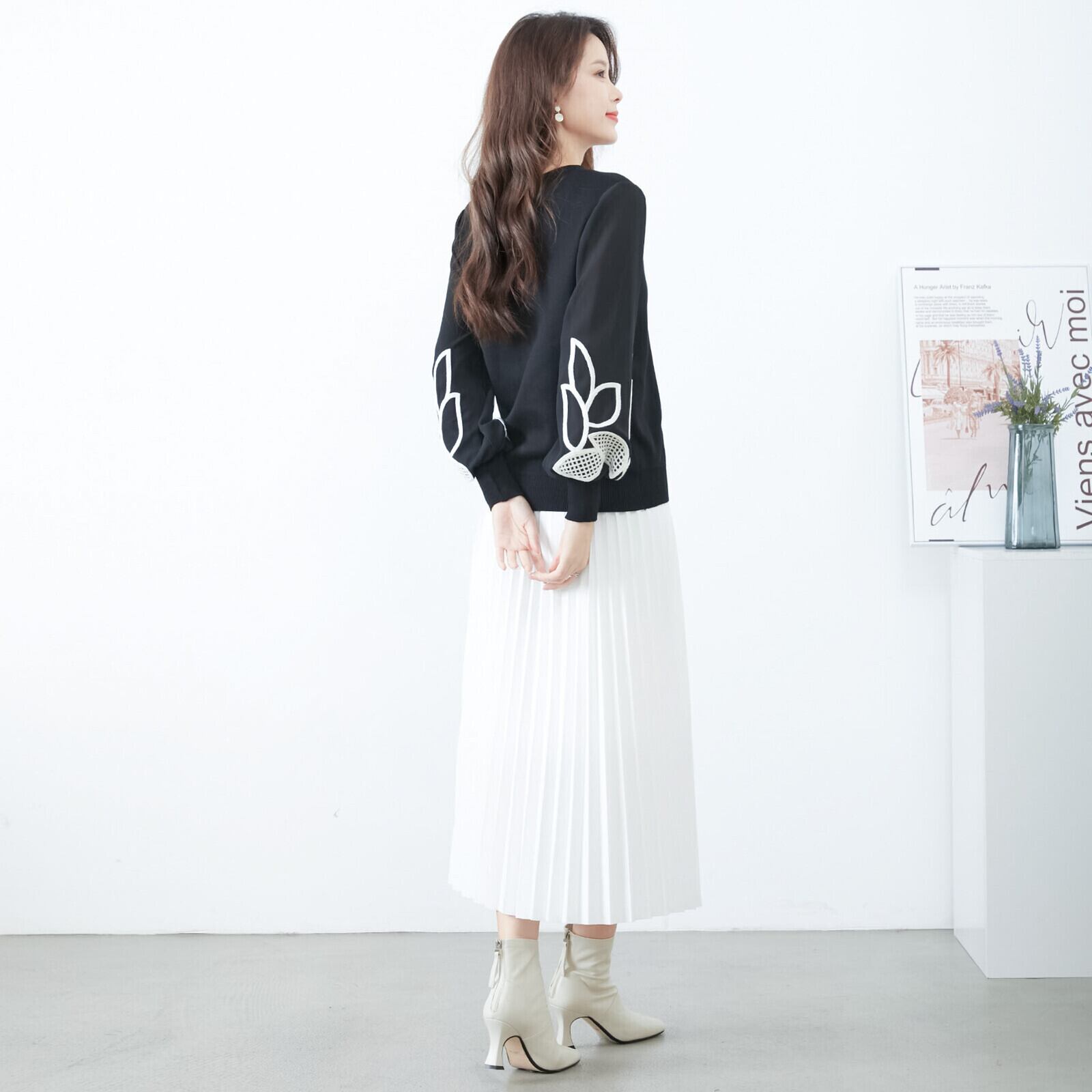 刺繍デザインのシフォン袖ニットプルオーバー