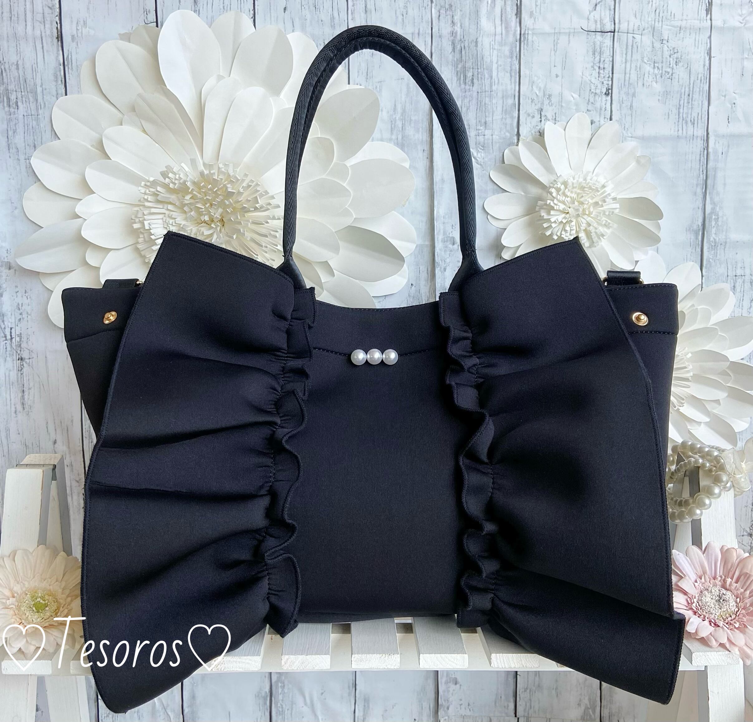 大きめ大粒パール付2wayフリルバッグ〈ブラック〉